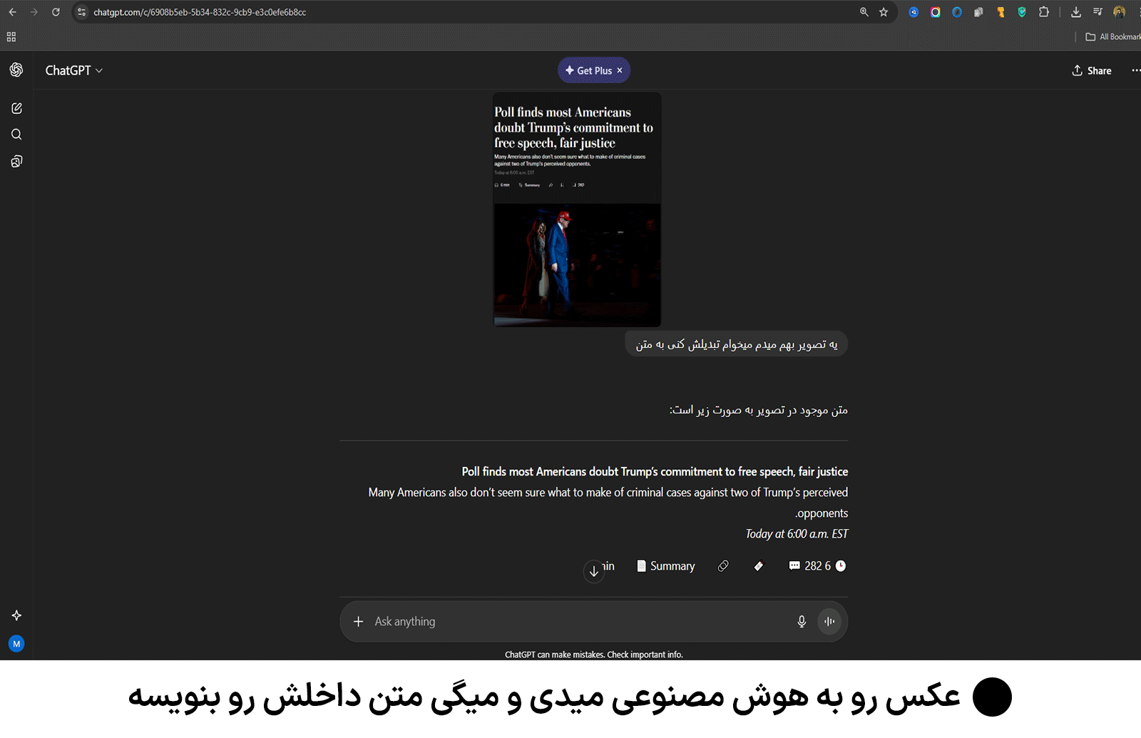 فقط کافیه بنویسی مثلاً: لطفاً متن داخل این عکس رو برام بنویس. چت جیپیتی خودش تصویر رو آنالیز میکنه و متنش رو برات درمیاره حتی اگه دستخطی باشه یا کیفیت عکس پایین باشه! - میتونی متن رو ترجمه، خلاصه یا ویرایش هم بکنی.
